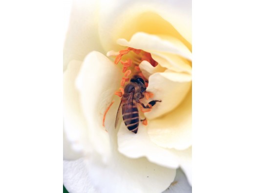 蜜蜂君が薔薇と楽しそうに会話しながら 薔薇の蜜をもらっていました