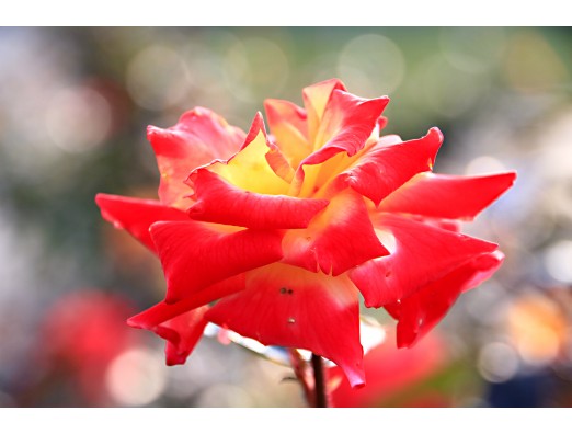 夕方の時間係りの人が薔薇に お水をあげていました その水が丸ボケに写り綺麗でした