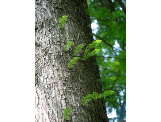 メタセコイヤの巨木の樹皮を破って出た若い葉です。自然の生命力の強さと面白さを感じます。