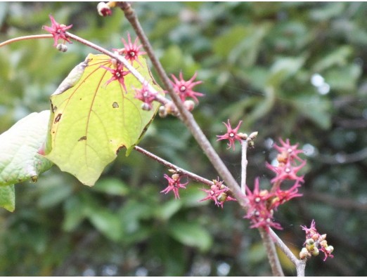 マルバノキ(丸葉の木)(Disanthus cercidifolius Maxim) 別名、ベニマンサク(紅満作) マンサク科 マルバノキ属 和名のとおり葉が丸く、別名のように紅花です。花径、0.8~1cmで星形で2個背中合わせに咲く、花色は赤色。中部以西の本州、四国に分布。