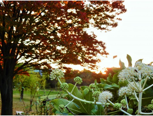 閉園前の駆け込み撮影。紅葉とヤツデの白い花のコラボレーション。