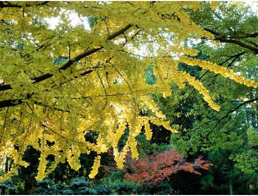 緑の背景にイチョウの黄色がまぶしい。モミジの赤がさし色になっています。