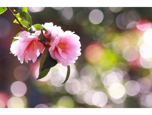 2015-12-08 撮影。 椿園の、バラ園寄りの所に咲くピンクの山茶花が、木漏れ日をバックに輝く瞬間。