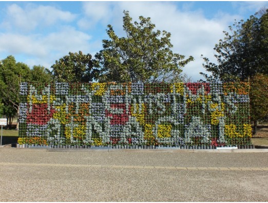 高さ、3m、横幅、約11mの巨大タペストリーです。 ビオラ、リュウノヒゲ、シロタエギク、オタフクナンテン、合計2112鉢。 撮影日:2015年12月19日 場所:大阪市 長居公園