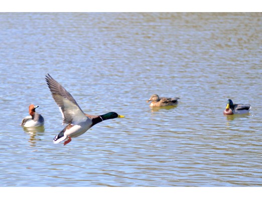 春の暖かい日差しに照らされ、カモたちが元気いっぱい飛び回ってます。