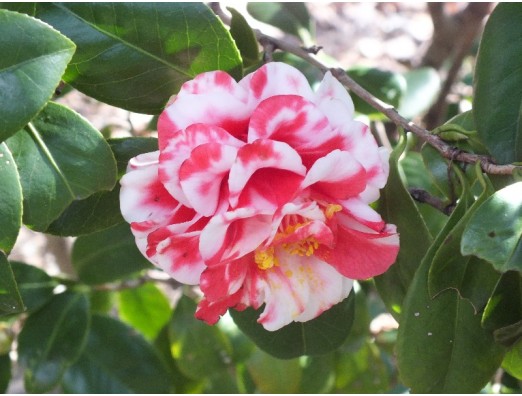 (椿)、イマガワシボリ(今川絞)(Camellia sasanqua) ツバキ科 ツバキ属 花期、10~2月 樹高、2~5m 今川絞は東京都杉並区今川で作出された品種。八重の絞り咲きとなります。絞りの花色は花によって変化があります。