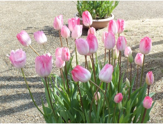 チューリップ、花名、ガンダーララプソディー (Tulipa Gander's Rhapsody) ユリ科 チューリップ属 花期、3~5月 草丈、15~50cm 1970年に登録されたチューリップで開き始めるとピンクの縁取りが鮮やかになる。