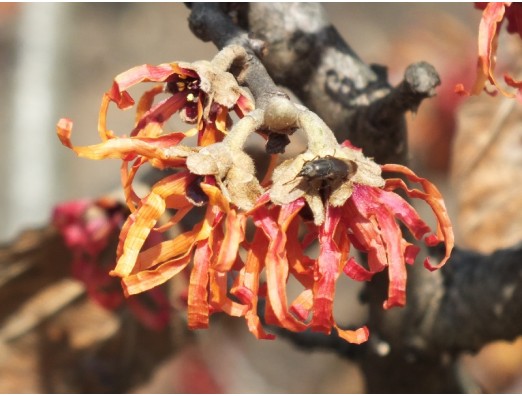 アカバナマンサク(赤花満作)(Hamamelis japonica var.) 別名、ベニバナマンサク マンサク科 マンサク属 花期、2~3月 樹高、200~500cm マンサクとは「まず咲く」とのことで、春が近づくと枯れ木の中に黄色い花をいち早くつけます。