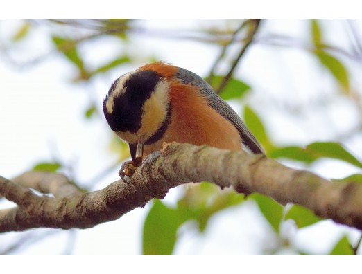 ヤマガラ、木の実を足でおさえつけてつつきます。