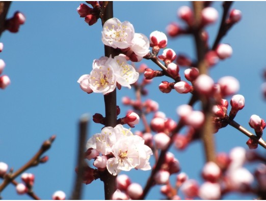 アンズ(杏)(Prunus armeniaca) バラ科 サクラ属 花期、3~4月 樹木、2~15m 中国の杏子を日本読みにした、ピンク色の花で桜とよく似ている。アンズは萼片(がくへん)が反りかえるが、ウメでは反りかえらない。