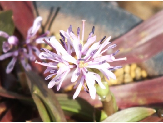 ショウジョウバカマ(猩々袴)(Heloniopsis orientalis) ユリ科 ショウジョウバカマ属 花期、3~4月 草丈、10~20cm 北海道から九州のやや湿ったところや田んぼの畔に生える多年草。花の色は生育場所によって、淡紅色、紫色、白色と変化する。