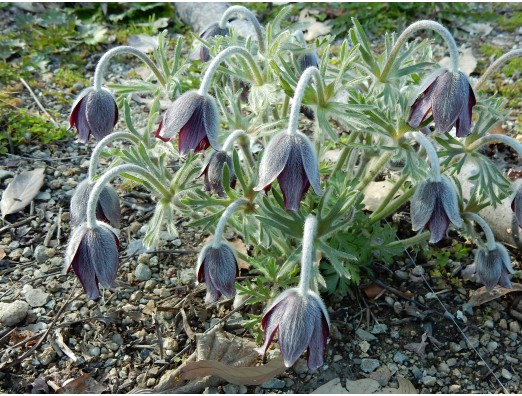 オキナグサ うつむいた蕾の表面はふさふさした毛で覆われています