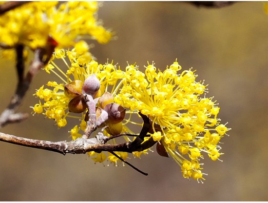 黄金色に輝くサンシュユの花