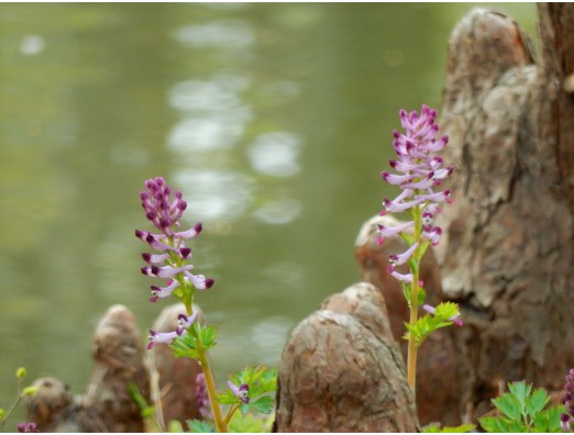 ムラサキケマンが気根の傍でひっそりと咲いていました。