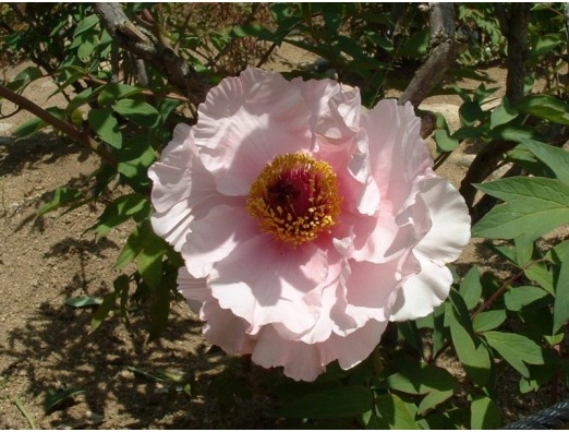 ボタン(御所桜・ゴショザクラ)(Paeonia suffruticosa Gosyozakura) ボタン科 ボタン属 花期、4~5月 樹高、1m以上 花径、15~20cmの中輪千重咲き、花色は桃色で咲き出しは桜色より色濃く満開後桜色になる。