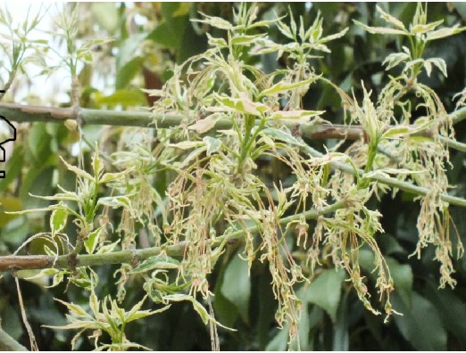 ネグンドカエデ・フラミンゴ(Acer negndo Flamingo) カエデ科 カエデ属 花期、4月 樹高、4~6m ピンク色の新芽がフラミンゴのよ色に似ている。葉は斑入りで夏に白くなり、その後に変わるのが特徴。