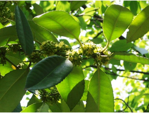 タラヨウ(多羅葉)(Ilex latifolia)雄花 別名、モンツキシバ モチノキ科 モチノキ属 花期、4~5月 樹高、10~20m 本州静岡以西~九州、中国、四国に分布する、葉の裏に傷を付けると黒く成り文字が書ける、雌雄異株。