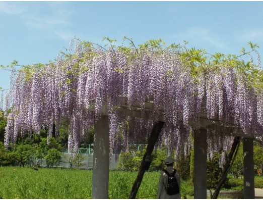 フジ(藤)(Wisteria floribunda)、別名、ノダフジ(野田藤) マメ科 フジ属 花期、4~5月 樹高、5~10mのつる性 日本原産で紫色の花が幹の方から先端に向かって咲き進む。