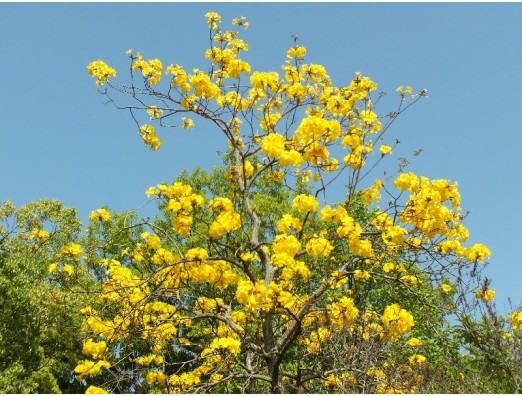 コガネノウゼンカズラ(黄金凌霄花)(Tabebuia chrysotricba) ノウゼンカズラ科 タベブイア属 花期、5月 樹高、5~8m ブラジル、コロンビア原産で、5月頃トランペット状で黄色の花を付ける、ブラジルの国花。