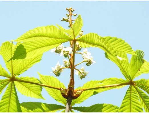 セイヨウトチノキ(西洋栃の木)(Aesculus hippocastanum) 別名、マロニエ トチノキ科 トチノキ属 花期5~6月 樹高、20~30m ギリシャ北部、ブルガリア、ヨーロッパで重宝されている、セイヨウトチノキは日本のトチノキの実と違い殻に刺が有る。