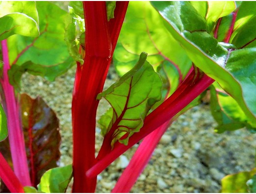 スイスチャード(レッドチャード)の毒々しい赤と緑のコントラストが美しい。