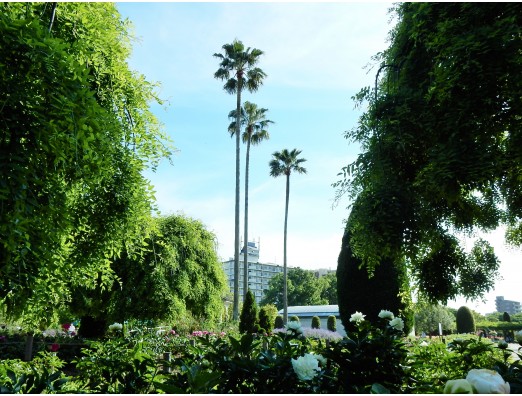 シダレエンジュが生い茂る緑の下でシャクヤクがしっとりと咲いています。
