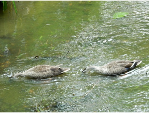 お食事中のカルガモたち。きれいに揃って潜ってました。