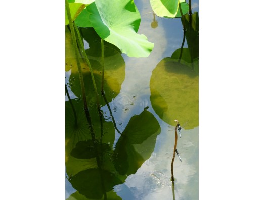 2016.7.5撮影 とても暑い日差しの中、トンボが休憩している傍らでアメンボはハスの葉の日陰にかくれんぼ。