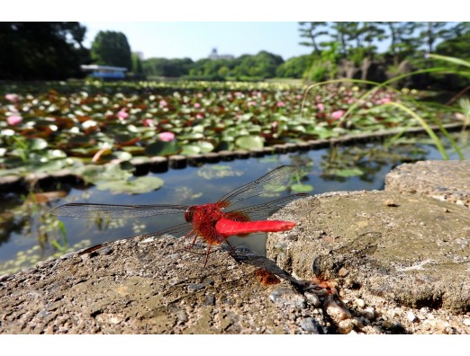 スイレンの花を見ながら翅を休めているのでしょうね。