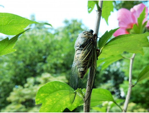 ムクゲの枝に止まっていたセミ。羽がまだ緑なので孵化したばかりでしょうか?