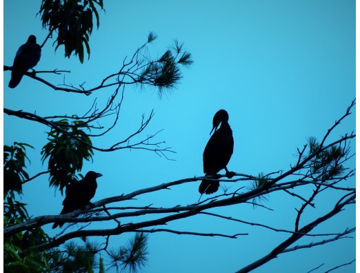 影絵のようです。くちばしでカラスとカワウだとわかります。