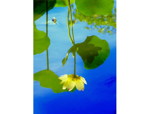 池の水面を見ていたら、蓮の別の綺麗さが青空と白い雲によって引き立たされていました。