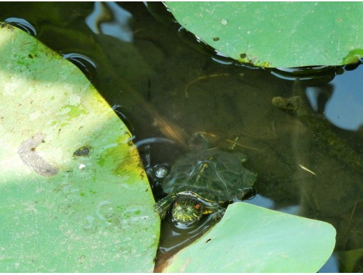 まだ10cmにも満たないアカミミガメの子供。かわいそうに甲羅の一部をかじられてました。泥の上に小エビもたくさんいました。