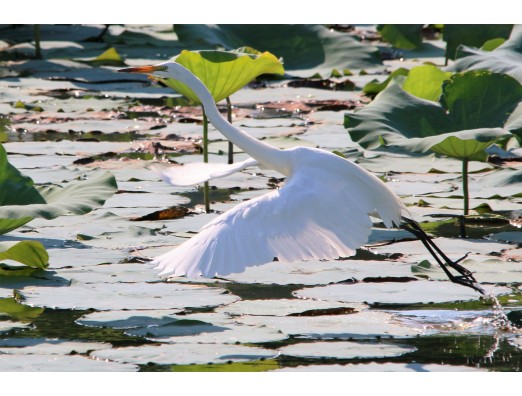 こんばんわ~(^O^)/ 大池にダイサギが、飛んで来ました。 上手に、蓮の葉の上を、歩きまわり。 飛んで行きました。(^_-)-☆