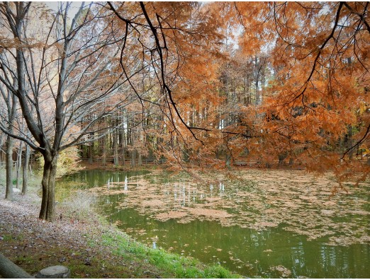 どこもかしこも落ち葉がいっぱい。この小池にもラクウショウの茶色い枯葉が散乱していましたが、私はこの景色が好きです。