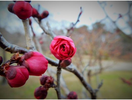 深紅の梅。バラのつぼみのよう。