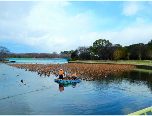 枯れたハスの刈り取り作業をしているところに遭遇しました。きれいな蓮の花を愛でる頃にはこの情景を思い出し感謝したいと思います。