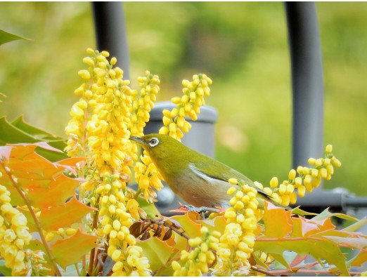 メジロがヒイラギナンテンの蜜を吸いにやって来ました。