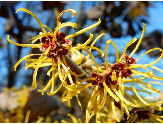 シナマンサク 鮮やかな黄色い花びらが青空に映えていました。