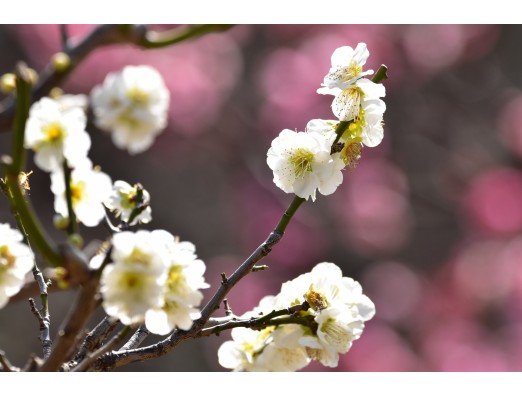 満開の梅園にて、紅梅をバックに白梅を撮ってみました