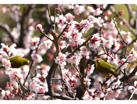 梅園で待っていると数羽のメジロがやってきてくれました 満開の梅の中で、メジロを撮ることが出来ました
