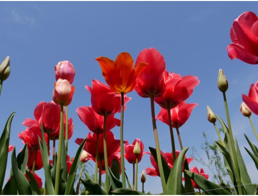 チューリップには青空が一番似合いますね。ポカポカ陽気の散歩日和。たくさんの来園者で賑わっていました。