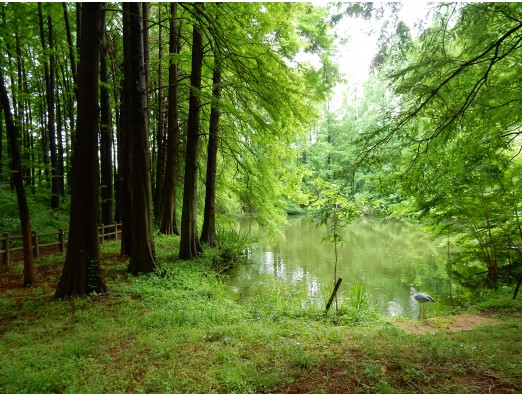 小池周辺の新緑と静けさ。アオサギが息をひそめて獲物を狙ってました。