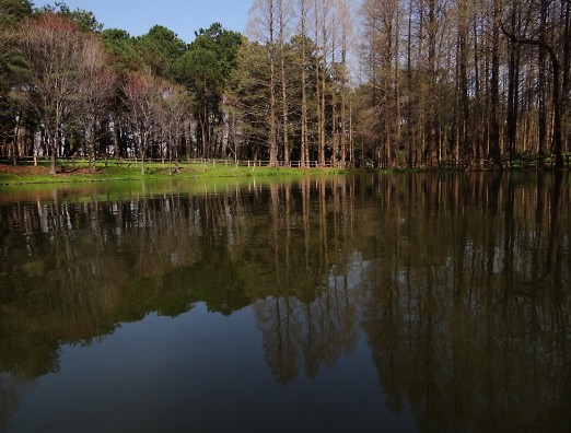 水面の空と木の揺らぎを美しく撮りたく、風が弱まるのを待ちました。