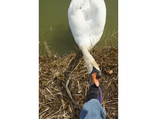 大池付近の水鳥を撮影していてコブ白鳥の近くまで行って撮影しようとしたら急接近してきて左足をガブリ!私の足が餌に見えたのかな?笑