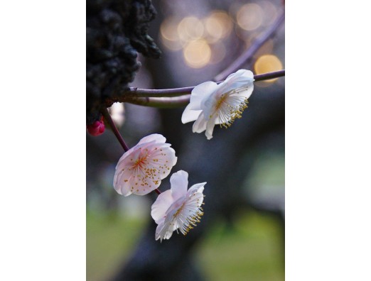 夕暮れ時の太陽光と木漏れ日を背景に梅の花を撮影したかった。