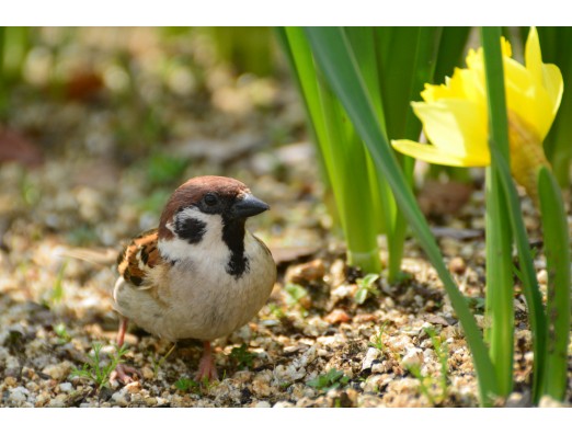 ラッパ水仙の辺りを雀がぴょんぴょん飛んでいましたが 小さいラッパ水仙の前で立ち止まり小さいラッパ水仙を見るしぐさがとても可愛かったです