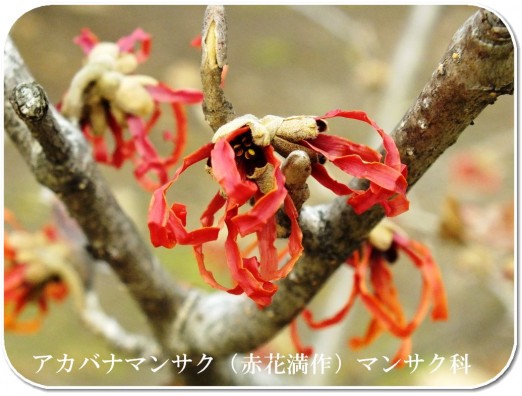 アカバナマンサク(赤花満作)(Hamamelis japonica var.) マンサク科 マンサク属 花期、2~3月 樹高、200~500cm マンサクとは「まず咲く」との事で、春が近づくと枯れ木の中に赤い花をいち早く咲かす。