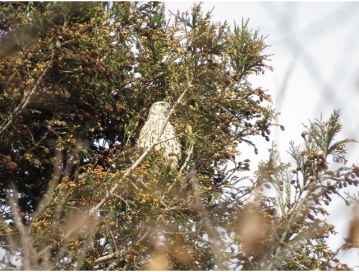 10人ほどの人がカメラを向けている方向に目をやると、高い木の上にちょこんと置物のように止まっていました。 枝をさけて撮れたらと移動している間に飛んで行ってしまいました。