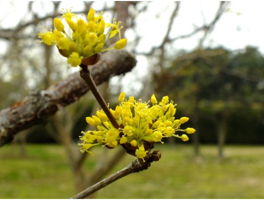 サンシュユ(山茱萸)(Cornus officinalis) 別名、ハルコガネバナ(春黄金花)、アキサンゴ(秋珊瑚) ミズキ科 ミズキ属 花期、3~4月 樹高、3~5m まだ新葉が開く前に黄色い花を沢山咲かせる。秋にはグミのように実が赤く熟し食べられます。